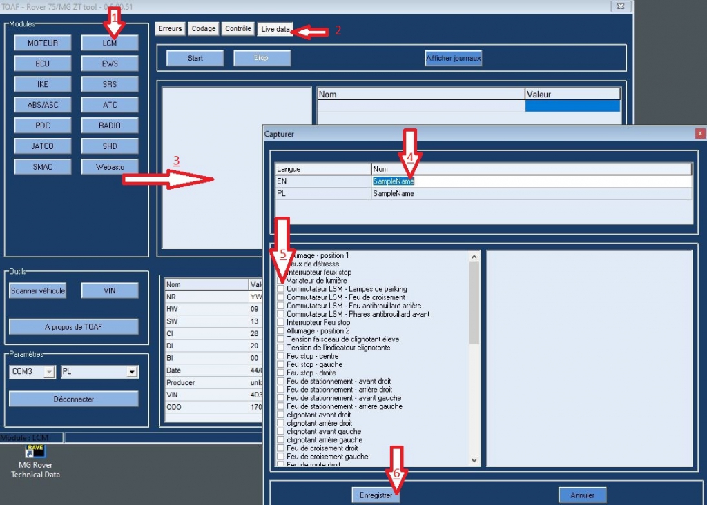 1 sélection module /  2 clic sur livedata  / 3 clic droit sur zone blanche, pour créer une liste / 4 Donner un nom à la liste / 5 cocher les cases des données que vous voulez mettre dans la liste / 6 Enregistrer