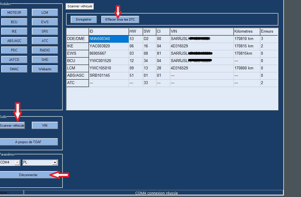 Une fois connecté au véhicule, clé en position 2, cette fonction vous permet de scanner rapidement tous les modules, de remonter les erreurs et de les effacer. Cela vous permet aussi de voir quels modules sont accessibles sur votre véhicule.